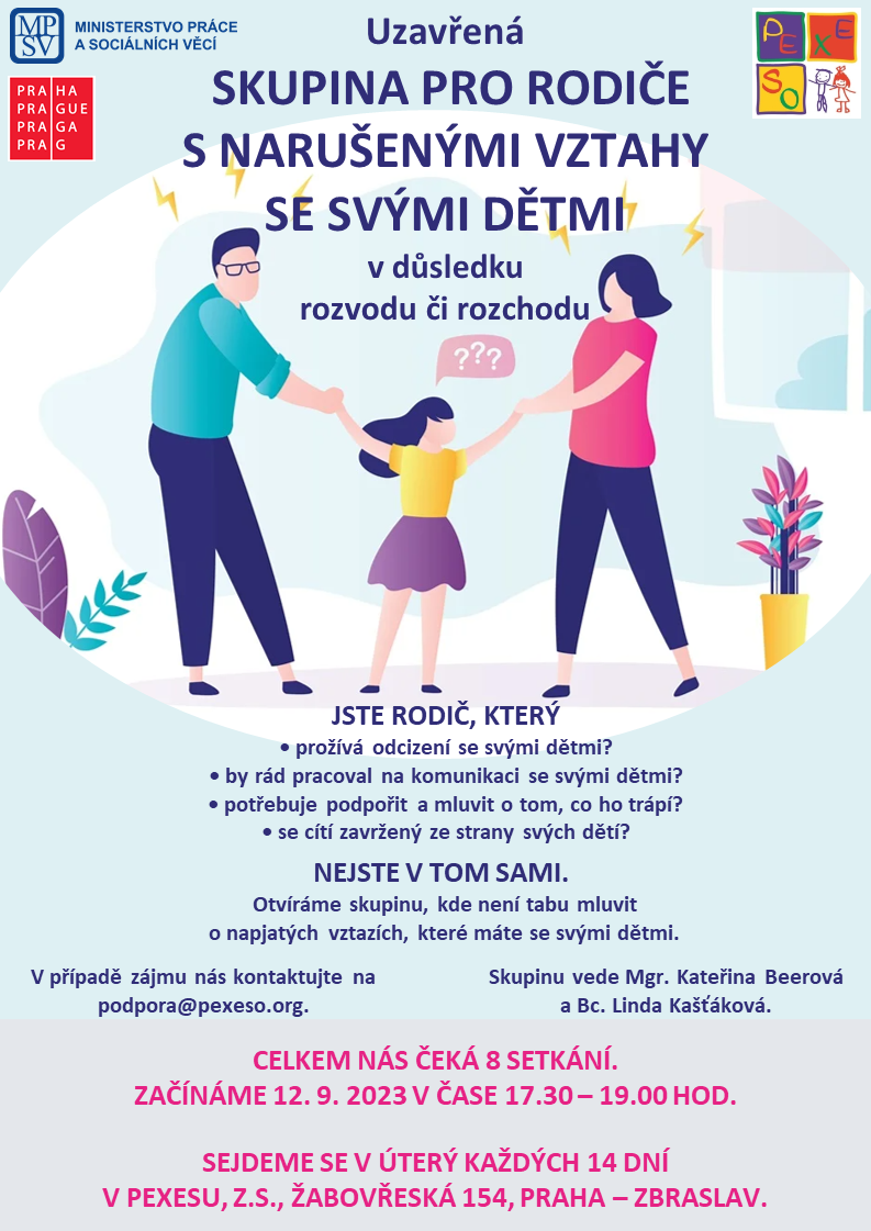 Od září otevíráme podpůrnou skupinu pro rodiče, kteří v důsledku rozvodu či rozchodu se svým partnerem mají konfliktní, velmi náročné či narušené vztahy se svým dítětem nebo dětmi.